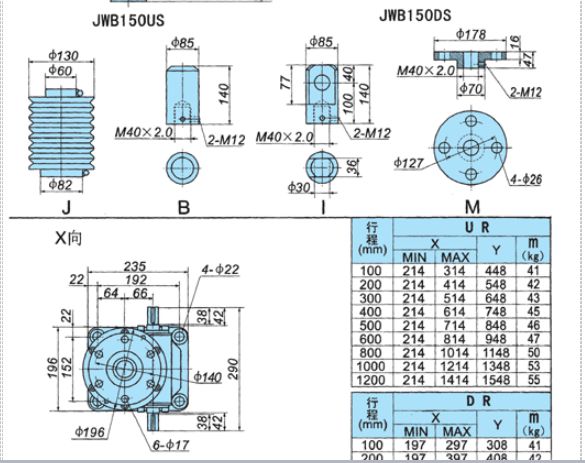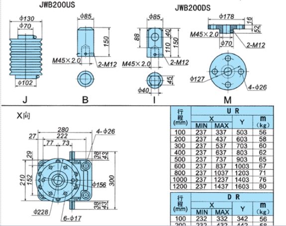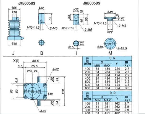 JWB型(普通滾珠絲桿型),適用于高速,高頻率和高性能的裝置中,主要構(gòu)成部件為精密滾珠絲桿副與高精度蝸輪蝸桿副。
